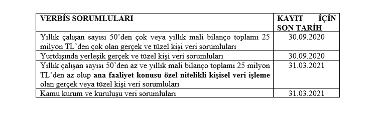 Kişisel Verileri Koruma Kurulu’nun 2020/482 sayılı Kurul Kararı ile kayıt yükümlülüğüne ilişkin süreler yeniden belirlenmiş olup, aşağıdaki gibidir.